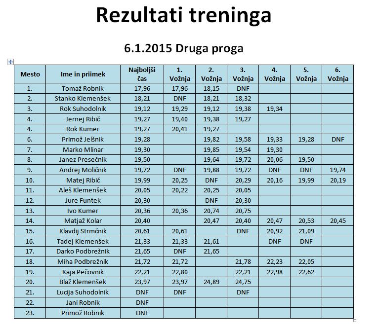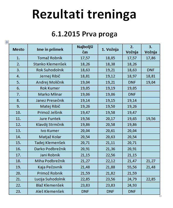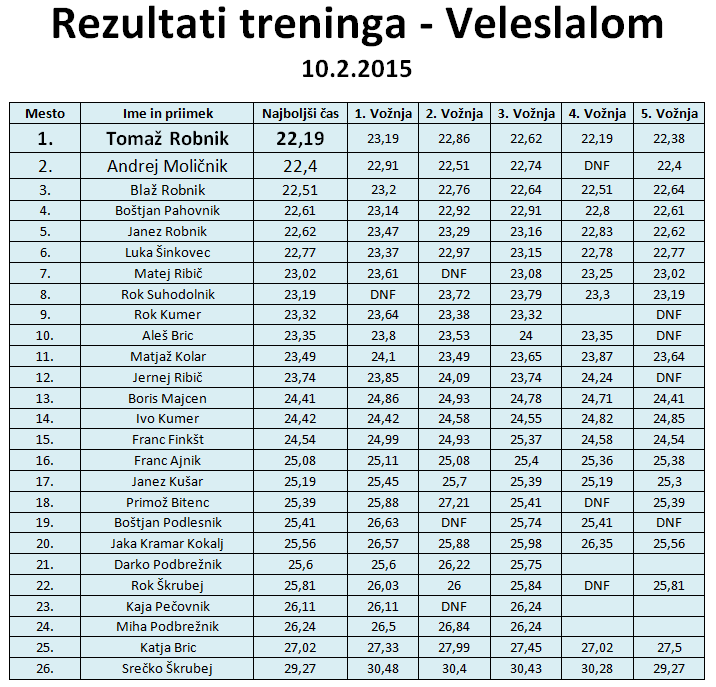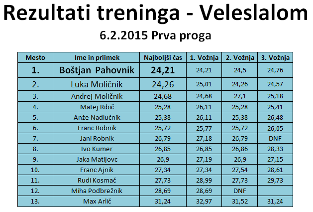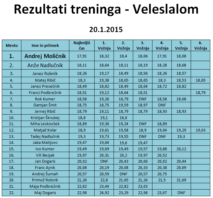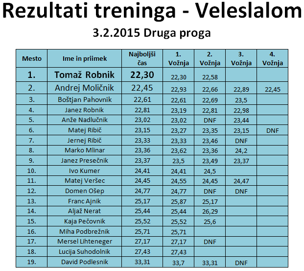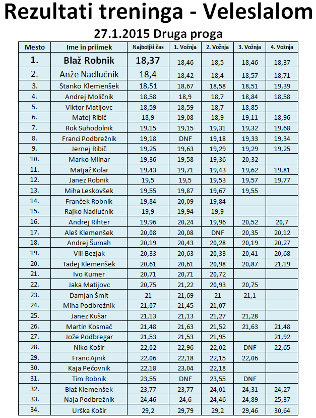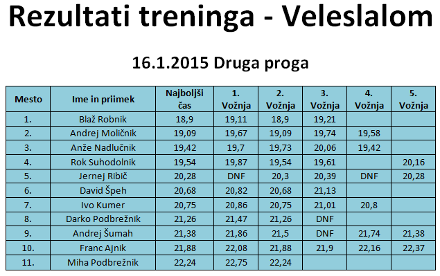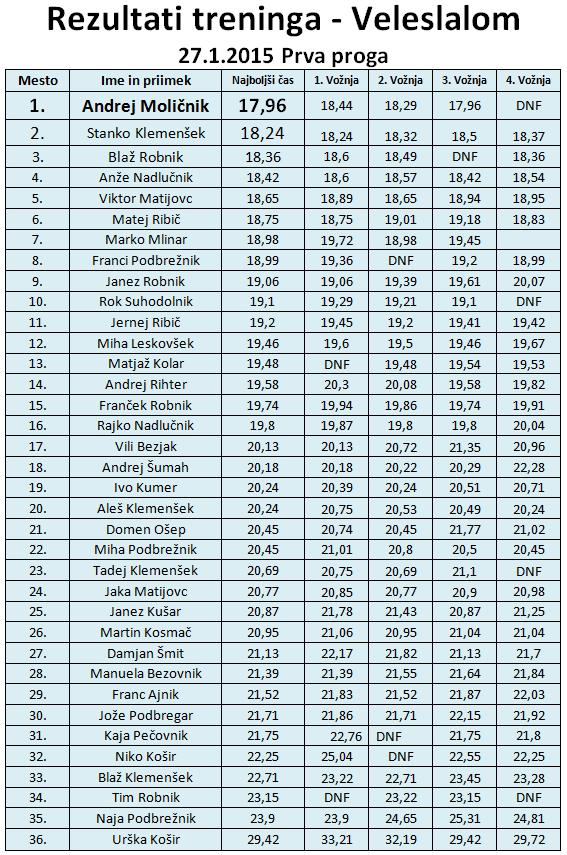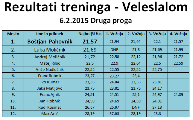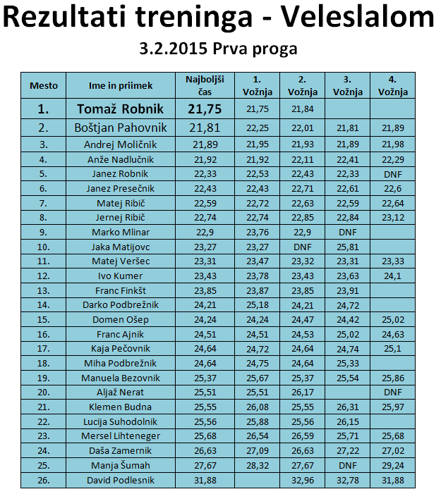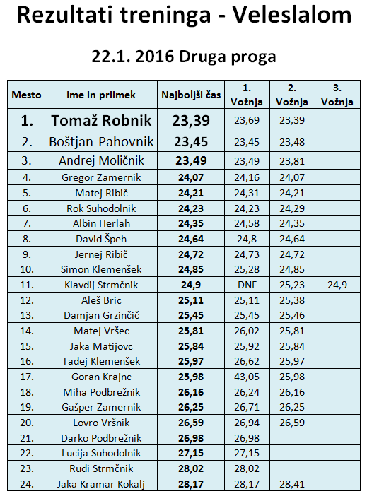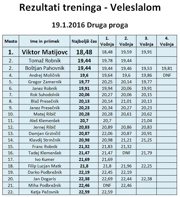 Rezultati treninga Veleslalom 22.1.2016 Prva proga