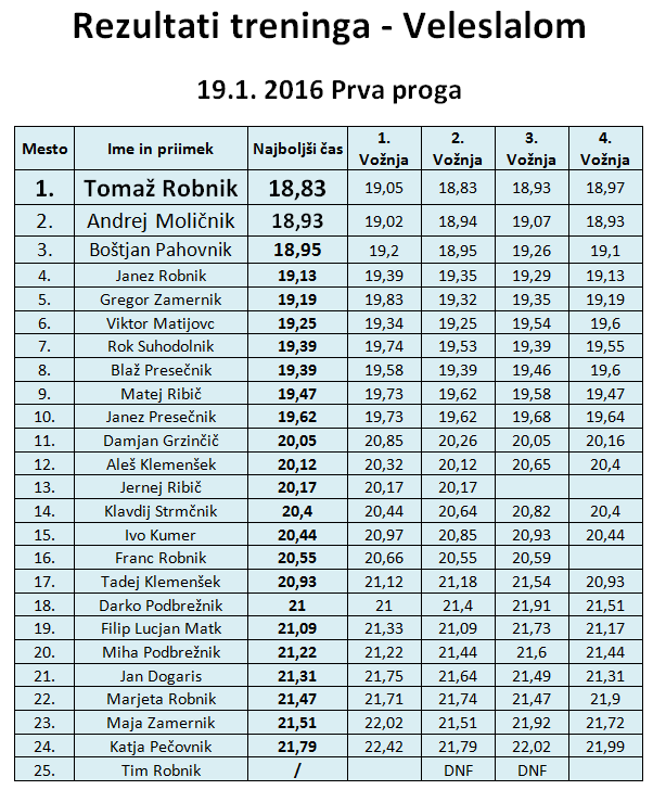 Rezultati treninga Veleslalom 19.1.2016 Prva proga